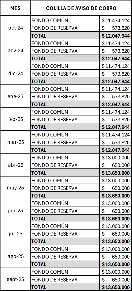 A continuación se detallan los montos que no han sido cobrados en las colillas de gasto común y que ya están pagados a su respectivo proveedor.