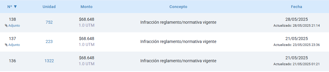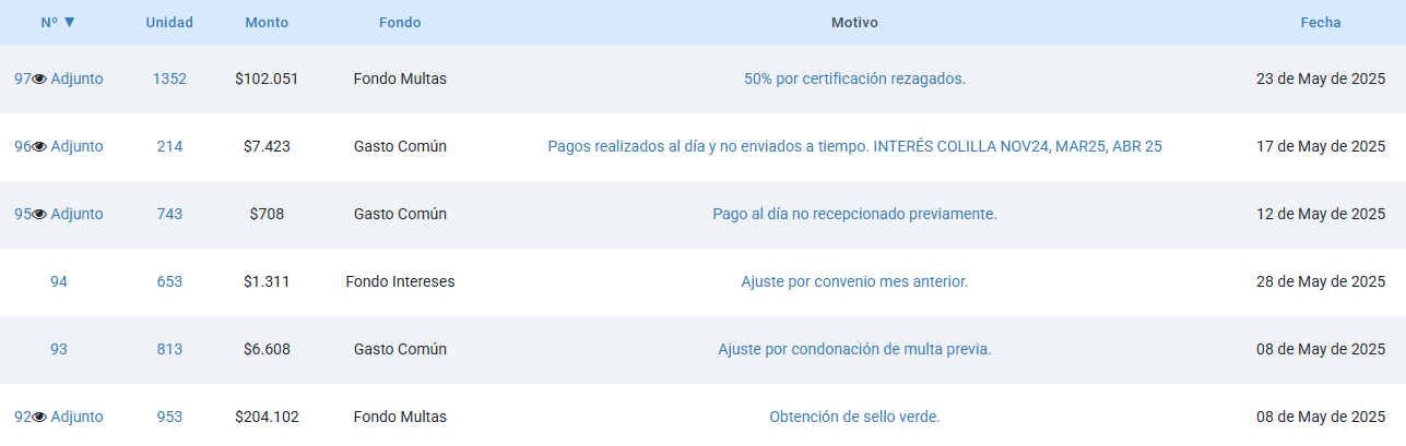 - Los montos reflejados aquí no necesariamente han aparecido en las colillas de gastos comunes. Revisar ítem "Detalle de movimientos: saldos pendientes por cobrar en gastos comunes"