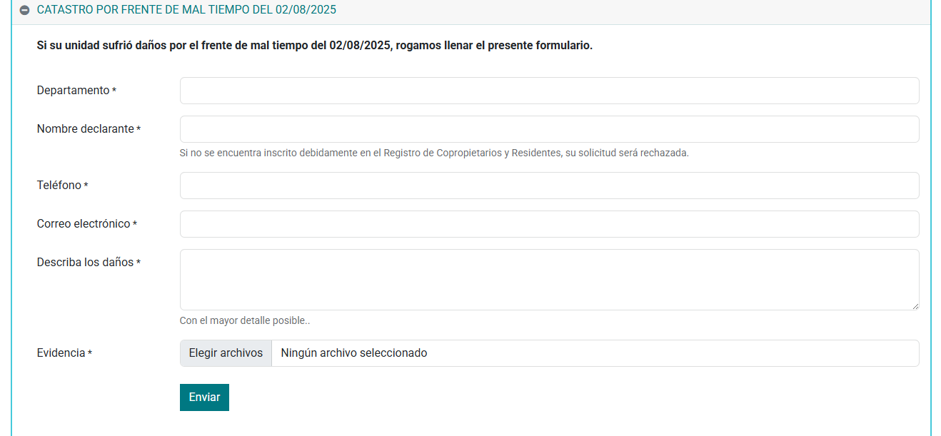 Se ha ampliado la sección TRÁMITES para catastrar los daños producidos debido al pasado frente de mal tiempo. Si su unidad sufrió daños a causa de las lluvias pasadas rogamos llenar el formulario para centralizar y evaluar un plan de acción para la reparación o la evaluación del cobro de seguros comprometidos, considerando que los mantenimientos de las techumbres y fachadas (siding) se encuentran al día.